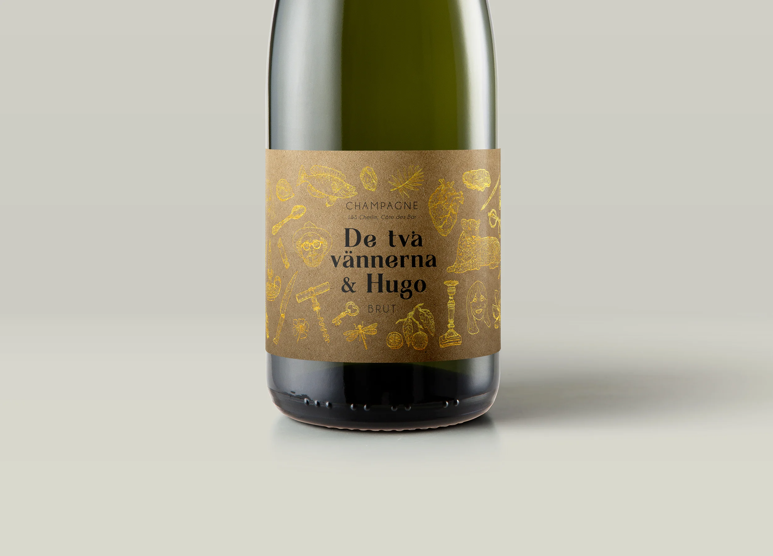 I got contacted by the restaurant Champagnebaren Forssén Öberg to make a design for their white house wine. The wine was called De Två Vännerna & Hugo after the two founders and Hugo who is the head chef. After the white wine they decided to make a champagne, it's their speciality after all. We decided to go for the same name but update the design with illustrations of the founders and Hugo mixed up with some of their favorite things. Production and tasting awaits this spring.